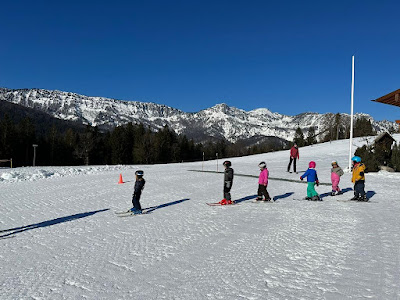 Ein Teil der Gruppe kann bereits Ski fahren und nutzt die Gelegenheit, um bereits erlerntes Können weiter zu vertiefen und auszubauen. Dabei werden sie abwechselnd von Hannah, Katharina und Manuel betreut. Die Kinder, die noch nicht fahren können, werden in einer 1 zu 1 Betreuung auf die Ski ⛷ gestellt und erhalten erstmal die Grundlagen wie Körperhaltung, Pizza und Pommes an den Ski erklärt und üben zunächst am kleinen unteren Hang mit ersten Erfolgen. Dann geht es auch für diese Kinder an den Lift. Einige können bereits nach kurzer Einweisung alleine Lift fahren, andere werden zwischen die Ski der Erwachsenen gestellt und fahren - huiiiii - den Berg hinauf. Betreut und gesichert durch die Erwachsenen ging es dann nach unten und alle Wichte sind wahnsinnig stolz Ski und Lift gefahren zu sein. Die Kinder, welche nicht beim Skifahren sind, gehen mit Reka und Rika zum Rodeln und nutzen die vielen Abfahrtsmöglichkeiten. Dabei werden verschiedene Variationen ausprobiert. Besonders beliebt sind der Doppelsitzer und die Rodelschlange 😁.